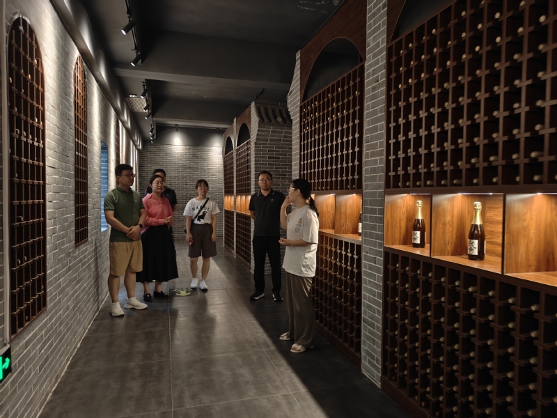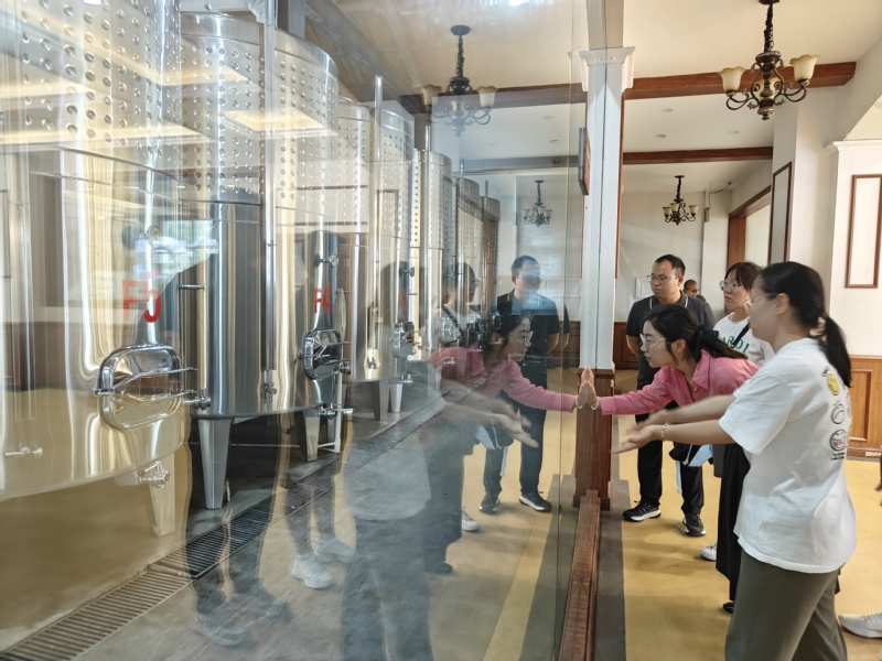 抵达产业园后,知行队首先走进葡萄酒酿造基地。在专业技术人员引导下,队员们沿葡萄种植园、发酵车间、灌装生产线依次参观,详细了解葡萄品种选育、绿色种植技术,以及从果实筛选、低温发酵到窖藏陈酿的全流程工艺。技术人员同步介绍产业园“合作社+基地+农户”模式,讲解如何通过产业化发展带动周边村民就业增收,让队员们对现代农业的规模化、标准化发展有了直观认知。